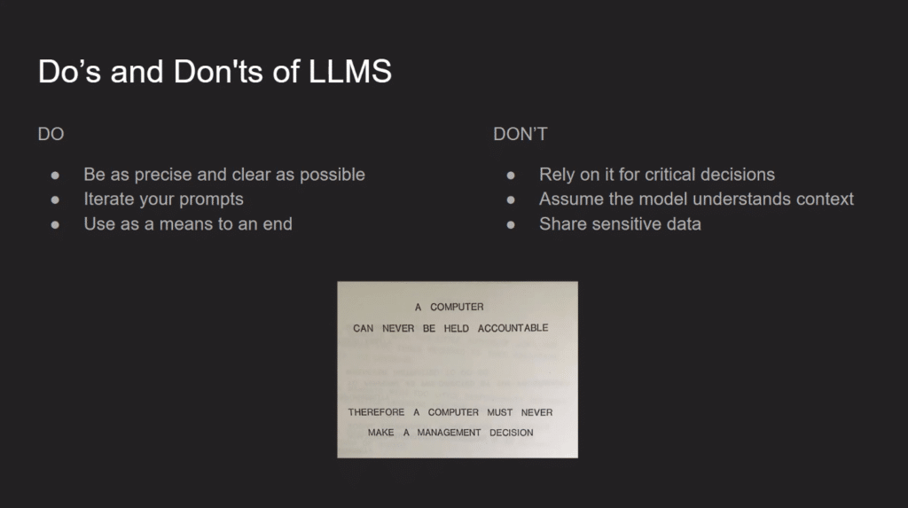 10:05 – Do’s and Dont’s of LLMS