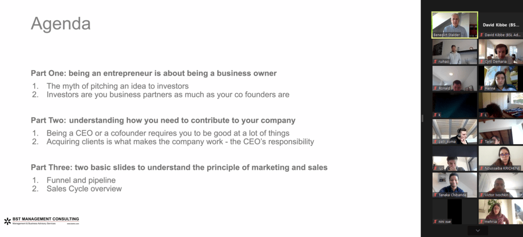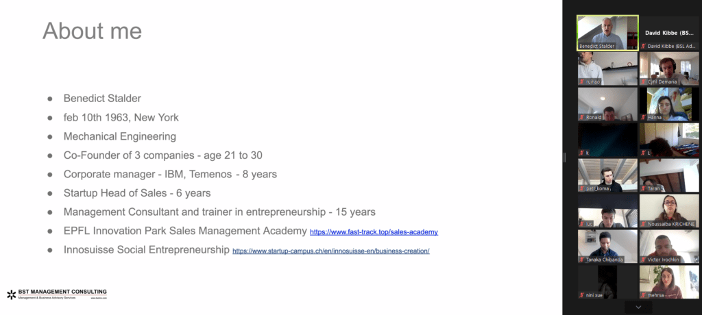 11:40 – Benedict Stalder, a consultant, coach and investor, has been able to connect with us. Benedict has over 30 years of experience in sales and sales management and brings sales expertise, senior management, and a trained eye to today’s entrepreneurial world.