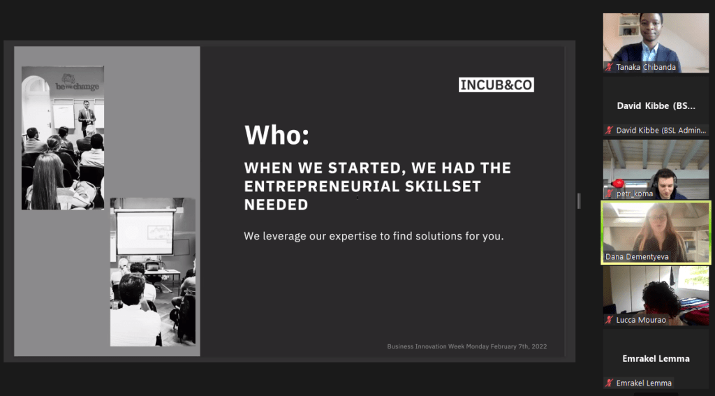 09:50 – Our First Guest Speaker is Dariya Dementyeva (Dana), from InCub&Co, an entrepreneur hub and incubator to support brave ideas. Dana completed her Master’s degree at BSL in 2017.